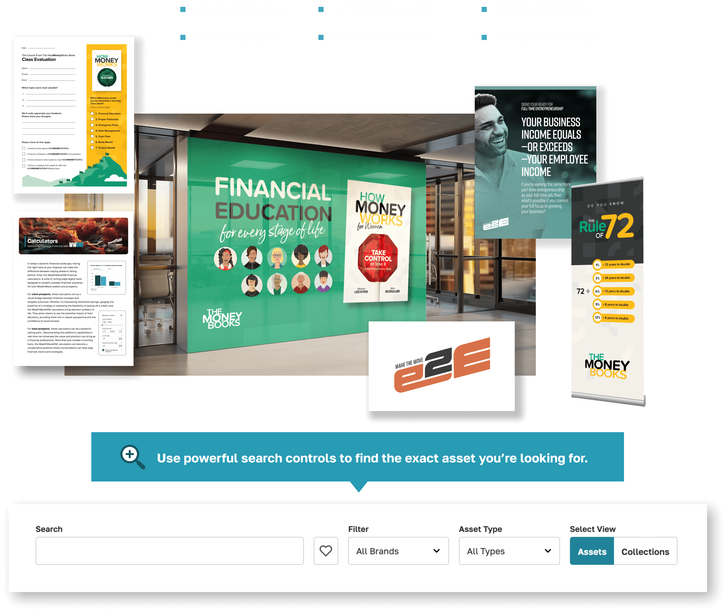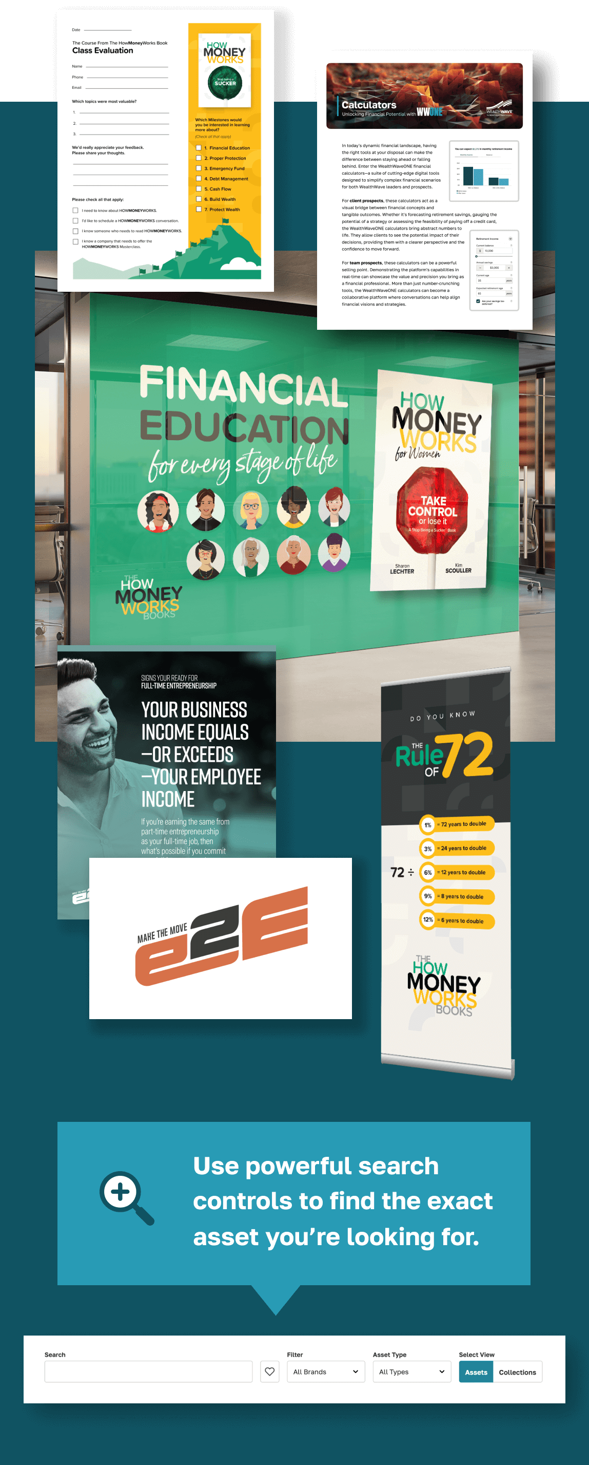 Chaque dirigeant de WealthWave qui développe son équipe et sa clientèle aura besoin d'une variété d'actifs de marque, approuvés par la conformité. Qu'il s'agisse de matériel de marketing, de documents à distribuer, de messages sur les réseaux sociaux, de logos ou d'enseignes, vous pouvez puiser dans notre vaste bibliothèque de contenu consultable, prête à l'emploi dès que vous en avez besoin.