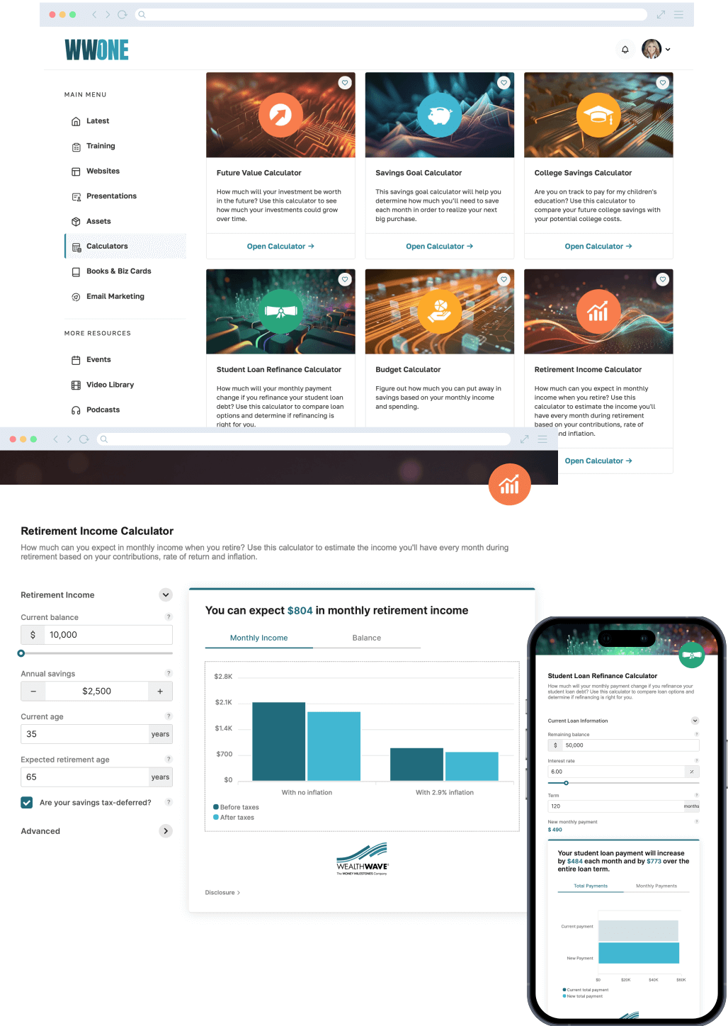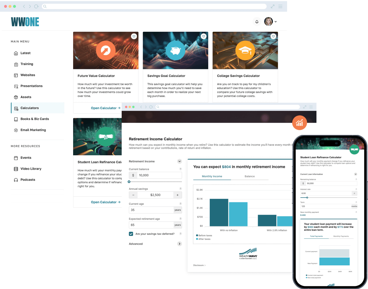 Les calculateurs de WWONE me procurent deux avantages majeurs. Elles font comprendre à mes clients potentiels qu'ils doivent prendre une décision financière pour changer de cap. Ils me donnent également l'occasion de leur expliquer comment nos produits et services peuvent les aider à opérer ce changement.